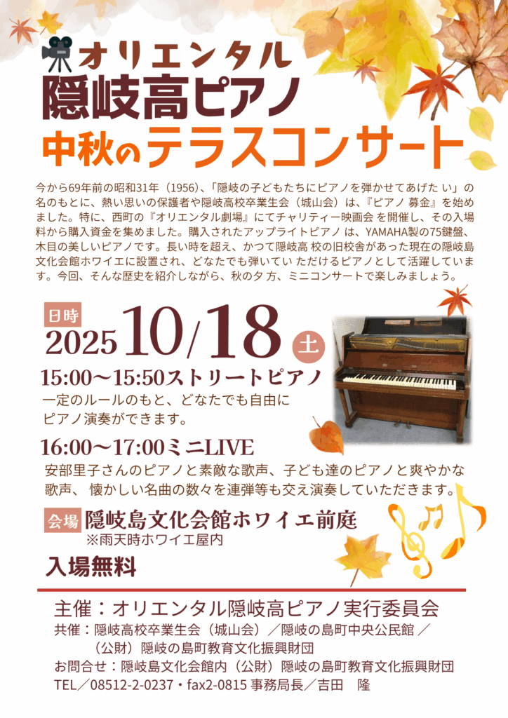 かつて隠岐高校の旧校舎にあったこのヤマハ製75鍵盤の美しいピアノが、長い時を経て、隠岐島文化会館ホワイエで復活!その歴史を紹介しながら、秋の夕暮れ、誰もが楽しめるコンサートを開催します。