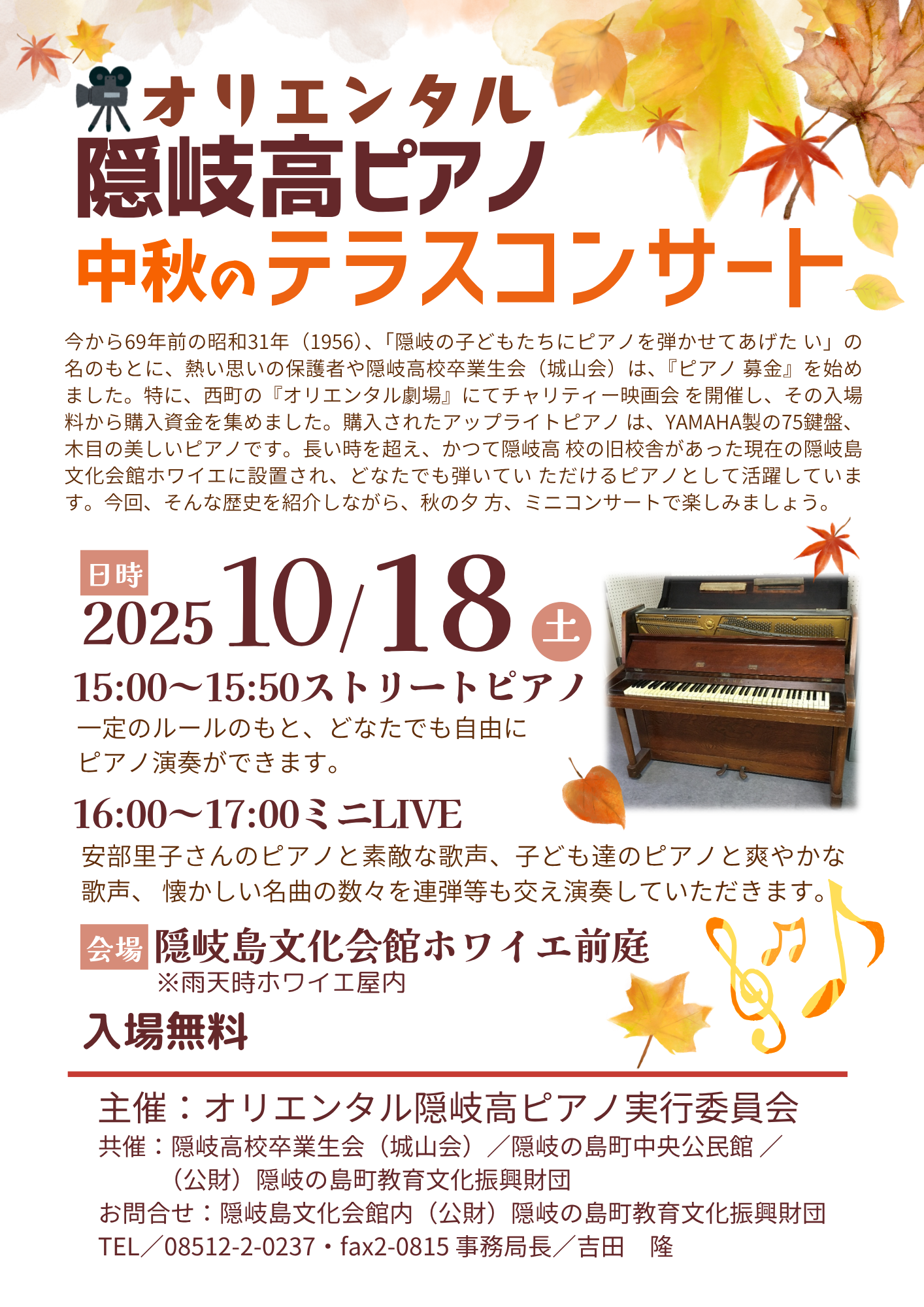 かつて隠岐高校の旧校舎にあったこのヤマハ製75鍵盤の美しいピアノが、長い時を経て、隠岐島文化会館ホワイエで復活!その歴史を紹介しながら、秋の夕暮れ、誰もが楽しめるコンサートを開催します。