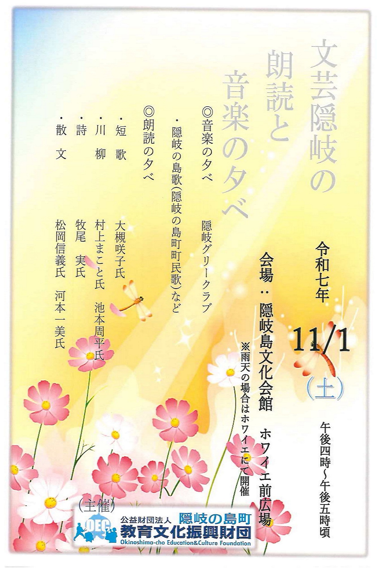 文芸隠岐の朗読と音楽の夕べ 2025年9月25日 最終更新日時 : 2025年9月25日 (公財)隠岐の島町教育文化振興財団 令和7年11月1日(土) 午後4時から『文芸隠岐の朗読と音楽の夕べ』 が開催されます。 音楽の部では、隠岐グリークラブの皆さんに、お昼のチャイムでお馴染みの 隠岐の島町町民歌「隠岐の島歌」を生で歌って頂きます。 朗読の部では、5名の皆さんに文芸隠岐に投稿していただいた作品の中から 思い入れのある短歌、川柳、詩、散文を朗読して頂きます。 皆さま、お誘い合わせの上、ぜひお越しください。 FacebookXBlueskyHatenaCopy
